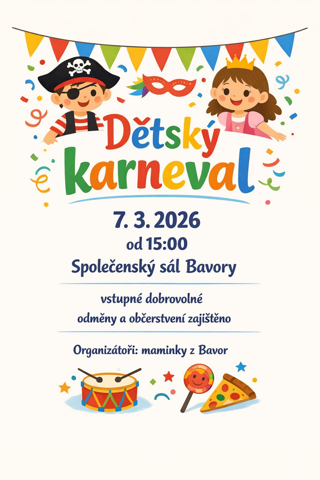 V sobotu 7.3.2026 bude ve společenském sále v Bavorech od 15 hodin DĚTSKÝ KARNEVAL.
